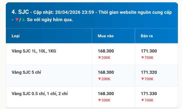 Giá vàng miếng SJC ngày 21/4/2026 niêm yết 168,3 triệu mua - 171,3 triệu bán. Giảm 200-700k/lượng. Vàng thế giới lên 4.826 USD/oz. Phân tích Fed, USD.