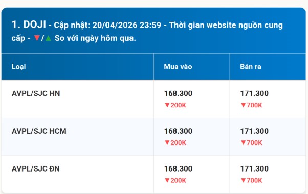 Sáng 21/4/2026, giá vàng miếng SJC tiếp tục điều chỉnh sau đà tăng mạnh các phiên trước. Tại DOJI và SJC, vàng miếng được niêm yết 168,3 triệu đồng mua vào và 171,3 triệu đồng bán ra — giảm 200.000 đến 700.000 đồng/lượng so với phiên trước. Cùng lúc, vàng nhẫn 9999 giảm nhẹ hơn, neo ở vùng đỉnh với chênh lệch mua-bán ~2,5-3 triệu/lượng.