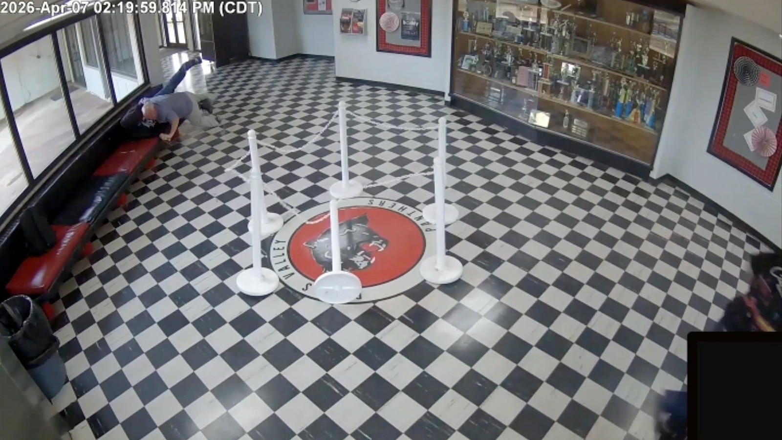 Video giám sát được công bố cho thấy rõ ràng toàn bộ diễn biến. Hiệu trưởng xuất hiện từ một góc hành lang, nhận ra mối đe doa và phản ứng trong vài giây. Ông lao thẳng vào học sinh, dùng cả trọng lượng cơ thể để quật ngã và khống chế. Cuộc vật lộn diễn ra trong khoảng 15 giây trước khi súng bị tây khỏi tay học sinh.